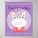 Ein niedlicher weißer Hase mit Herznase und Herz auf den Ohren trägt ein rotes, kariertes Shirt. Gruß: Frohe Ostern gerahmt in Lavendel und lila.