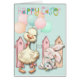 Eine niedliche Ostersaison-Grußkarte mit einer gelben gelben Ente mit einem Haufen pastellfarbener Ballons. Die Ente steht vor einem passenden Pastellzaun, und ein kleines, weißes Kaninchen mit einem kleinen Strauß an Blume. Der farbenfrohe Text sagt Happy Oaster. Die Bilder und der Text werden auf einem hellpastellgrünen Hintergrund platziert. Die Innenseite der Karte verfügt über zwei zusätzliche Textfelder, die Sie anpassen können.