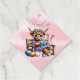 Ein hübsches pastellfarbenes Ostergeschenk-Tag mit einer Hochlandkuh in einem blau-weiß karierten Kleid