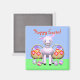 Ein Magnet mit einem Kunstwerk eines kleinen Lamms mit Korbkörben aus Ostereiern und hellen, farbenfrohen Blume. Im Text steht "Happy Oaster!"