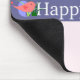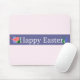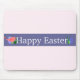 Ein niedlicher, kleiner Roter Vogel mit "Happy Oaster" sitzt auf einem lila Banner. Die Hintergrundfarbe ist Lavendelrot.