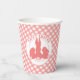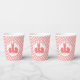 NewParkLane - Paper Cups, mit drei niedlichen kleinen Bollen vor einem Hintergrund mit einem rustikalen korallenrosa Gingham-Muster und einem Happy Oaster Wunsch. Passende Produkte, wie Papierservietten & Teller, in dieser Kollektion erhältlich.