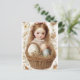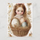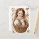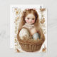 Ein Etikett in einem offenen Rahmen für eine Packung von Wachteleiern, ein Portrait eines niedlichen Mädchens, nah mit einem Eierkorb aus Wachteln, Grafiken, Details, Mustern, kleinen, runden Eiern mit großen bunten Flecken, Kindergeschichten, Buchstil, abgestufte Farben, Aquarellstil