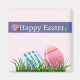 Farbenfrohe gestreifte Eier sitzen im grünen Gras auf einem schwarzen Lavendel-Hintergrund mit einem "Spring"-Banner. Klicken Sie auf "Anpassen", um personalisierten Text hinzuzufügen oder die Hintergrundfarbe zu ändern; falls gewünscht.