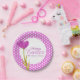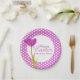 Moderne, helle Ostertulpenpapier-Teller in grün lila und weiß. Hübsche Aquarelltuppenkunst und ein Polka-Dot-Rand. Teller können mit dem Namen Ihrer eigenen Familie oder mit dem Osterfest personalisiert werden. Originelle Aquarellkunst und Design von Sarah Trett. www.sarahtrett.com für www.mylittleeden.com