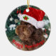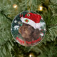 This cute ceramic ornament feature a picture of a lovely chocolate labradroodle dog wearing Santa's hat, sitting near a decorated Christmas tree and the words "Happy Pawlidays".