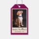 Happy Pawlidays Funny Pun Pet Foto Geschenk Tag. Einfaches und modernes Urlaubsdesign mit einem Foto für Haustiere. Der Hintergrund ist beige und dunkelrot lila. Fügen Sie Ihr Foto, Familienname und Jahr hinzu.