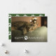 Diese Katze liebt die Urlaubskarte mit der Phrase "Happy Pwlidays" in Weiß, mit einem kleinen Pfotendruck in der Mitte der beiden Wörter. Die Rückseite ist ein grün-weißes Druckmuster.