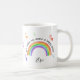 Farbenfrohe Tasse mit Regenbogen- und Liebe-Herzen, die Sie für Ihren Freund, Verwandten oder Lehrer zum Beispiel personalisieren können. Niedliches und fröhliches Design mit "You make my world a happy place" in handgeschriebener Typografie und elegantem Drehbuch.