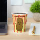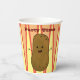 Niedlicher brauner Cartoon glückliche Kartoffel mit einem großen glücklichen Lächeln auf seinem Gesicht Party Zeit über seinem Kopf ein orange und gelb Streifen Hintergrund.