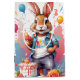 Lächelndes Cartoon Kaninchen mit Kuchen. Das Design für Geschenke für Kinder jeden Alters.