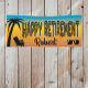 Wünschen Sie eine fröhliche Pension mit einem Strandthema: Palmen, Liegestühle, Sonnenbrille, ein Ti-Schriftart und ein blauer und goldener Hintergrund. Bearbeiten Sie den Namen zu Ihrem Ehrengast. Ideal für jemanden, der den Strand Lieben oder sich nach Florida zurückziehen möchte, oder nur für ein lustiges Party in der Pension.