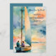 A Happy Retirement Party Invitation designed with a watercolor sailboat theme in shades of blue, orange and turquoise. The front text includes: Please Join us For A, Happy Retirement Party, on a background of a couple sailing into the sunset. The reverse text includes: Honoring, The Couple's Names, The Date, Time, Location, Address and RSVP Details. To personalize, simply insert your text into our easy template, replacing the sample.