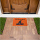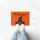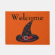 Das Bild ist ein traditioneller, schwarzer Hexenhut mit orangefarbenen Sternen und einem silbernen Verschluss. Happy Samhain ist auf dem Hut geschrieben. Willkommen ist auf der Matte geschrieben. Bild ist mein Originalbild. Sehen Sie in meinem Shop Art by MAR nach, um Produkte mit diesem Design zu kombinieren.