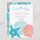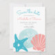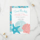 Beach Thema Hochzeit Save the Date Karte verfügt über Sand Dollar, Seestern (Seestern) und Jakobsmuscheln in tropischen Korallen und Aqua blau. Die Rückseite ist eine nautische Muschel, Wal Schwanz & Wirbel Muster auf einem türkisfarbenen Hintergrund. Ideal für Hochzeiten am Strand, im Wasser, an der Küste, im Sommer, am Meer und auf der Insel. Original-Kunstwerk KL Stock.