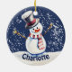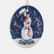 Aquarellmalerei eines glücklichen Schneemanns auf personalisierten Weihnachtsschmuck.