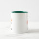 Niedlicher Urlaubskaffee / heiße Kakao-Tasse mit einem glücklichen Winterschneegesicht mit warmen rosigen Wangen, Karottennase, Augen und Lächeln aus Kohle. Schneeweiße, schwarze und orangefarbene Farben. Personalisieren Sie Ihre Daten mit einem Namen oder einem anderen benutzerdefinierten Text. Die grüne Tasse mit zwei Tönen kann modifiziert werden.