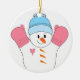 Ein großartiges Schmuckstück für Schneefreunde. Dieser kleine in einem blauen Hut und rosa Fäustlinge. Also glücklich...