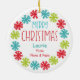 Dieser niedliche Weihnachtsschmuck zeigt ein Bild eines glücklichen Schneemanns, der in Rot und Grün gekleidet ist und einen gestreiften Bonbons hält. Der Schneemann ist mit goldenen, roten und blauen Schneeflocken gerahmt. Auf der Rückseite des Ornaments befindet sich der gleiche Schneeflockenrahmen mit benutzerdefinierten Textfeldern für den Namen Ihres Kindes und Ihre Unterschrift. Ideal für ein Kind von Großeltern, Mama & Papa oder irgendjemand!