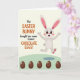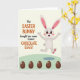 Designed with a creamy background and soft spring colors, this card features a friendly white bunny on the right, standing upright with pink-lined ears and both arms lifted as if reaching out for a hug 🐰. The bunny’s rosy cheeks, bright eyes, and open smile give it a sweet, affectionate look, like it’s greeting a close friend. On the left side, a large Easter message sits in stacked lines, mixing warm orange words with deep black words for contrast. The lettering is big and easy to spot, leaving plenty of open space around it so the design feels airy. Along the bottom, a gentle green strip suggests grass, grounding the scene without crowding it. Resting on that green base are five smooth, dark brown egg shapes with small highlights that make them look glossy and treat-like, adding a cozy shared-surprise feel 🐇. A small blue oval detail appears on the green area near the lower edge.