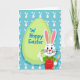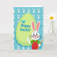 Designed with a springtime look, the card centers on a large pale green egg shape that fills most of the front like a soft backdrop. Across the egg, a bright blue greeting sits prominently, with a small blue butterfly nearby as a gentle accent 🌷. In the lower right, a friendly white bunny peeks out from behind the egg, its tall ears lined in pink and its round blue eyes giving a tender, welcoming gaze 🐰. The bunny wears red overalls over a green shirt, adding a cozy, companionable feel, as if it’s happily showing up to celebrate with someone special. One paw is raised in a thumbs-up, while the other holds a paintbrush with natural bristles and an orange handle, hinting that the egg has just been decorated with care. The background is sky blue and covered in a repeating pattern of small white bunny-head shapes, each with a simple smiling face. The blue greeting text is placed across the center of the green egg, and the butterfly sits close to the lettering on the egg’s surface. Behind everything, the sky-blue field is packed with evenly spaced, tiny white bunny faces in neat rows.
