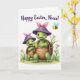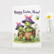 Designed with two green-skinned reptile characters with segmented brown shells, this illustration shows them in matching purple wide-brimmed hats topped with soft pink bows. A larger figure stands slightly behind the smaller one, leaning in with a caring posture that reads like close friendship or a gentle family bond. Their wide smiles and rosy cheeks face forward, and the smaller character’s upward glance adds a sweet, affectionate connection. They stand on a light green patch of grass sprinkled with tiny white flowers with yellow centers, giving the scene a springtime feel 🌷. In the upper right, a small striped winged insect hovers, adding a touch of motion without crowding the space. Above the characters, a seasonal greeting appears in purple lettering, centered near the top against the white background. The smooth shading highlights the rounded faces, the shell segments, and the soft folds of each pink bow 🐰. The white backdrop keeps the purple hats and yellow flower centers especially noticeable.