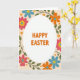 This card features a long white oval centered on a soft peachy-beige background, creating a calm focal area for a friendly seasonal greeting. The main text sits in the middle of the oval in warm orange lettering, easy to spot at a glance. Around the oval, a ring of stylized flowers and leafy vines forms a gentle frame, like a bouquet arranged to lean in close. Petaled blooms in rosy pink, calm blue, and sunny orange cluster along deep green stems, each flower marked with a bright yellow center and an occasional tiny blue dot that feels like a shared secret between friends 🌷. Small leaves tuck between the blossoms, giving the border a cozy, wrapped-around look that reads as affectionate without needing extra words. Across the peach background, a few tiny star-shaped yellow flowers are scattered, adding light decoration that doesn’t crowd the scene 🐰. The overall look stays flat and graphic with crisp edges and clear color areas, and the last detail you notice is the neat sprinkle of those little yellow stars floating around the floral frame.