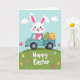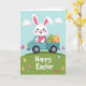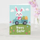 This card shows a fluffy white bunny with pink-lined ears and rosy cheeks, smiling with a tiny tongue showing as it drives a pastel teal pickup across a spring scene 🐰. The bunny’s bright eyes and relaxed posture give it a sweet, friendly warmth, like it’s on its way to surprise someone special. Behind the cab, the truck bed carries two large decorated eggs, one with green stripes and small pink flowers, and the other in sunny yellow with orange stripes and little pink hearts. The background is a pale blue sky with soft, puffy clouds floating high above. Below, a gently sloped green hill is dotted with smaller patterned eggs, scattered blossoms in pink and blue, and a few butterflies drifting through the air 🌷. Along the bottom edge, a seasonal greeting appears in large white lettering, centered and easy to spot against the green. A few tiny blossoms and eggs cluster near the lower foreground, with butterflies angled as if mid-flutter over the hillside.