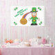 Illustrierter Cartoon Kobold mit Regenbogen über Goldtopf auf Weiß.