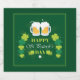 Ein Flaschenetikett mit festlichem Happy St. Patrick's Day Design mit 2 Tasse frostigem Bier und einigen Kleeblatten auf grünem Hintergrund.