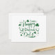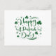 Ein festliches St. Patrick's Day Design mit grünen Schriftzeichen, Kleeblättern, Sternen und dekorativen Wirbel auf schwarzem Hintergrund.
