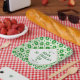 Weiß-orangefarbene vierblättrige Kleeblattmuster auf kariertem Hintergrund mit bearbeitbarem Text "Happy St Patrick's Day" Datum und Familienname leicht personalisiert, zum Party, Abendessen, Cocktail oder zu anderen Anlässen.