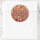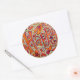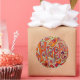 Das Wort "Happy" wird in einer hellen, orangefarbenen Farbe vor einem regenbogengespeckten Hintergrund gemalt. Hearts verschiedener Größen überschneiden sich und schwimmen wie Schmetterlinge um den Text herum. Dieses Bild kommt auch in einer Glitzer-Version.