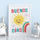 Buenos dias! Hänge diese fröhliche Kinderzimmer-Kunst in deinem neuen Baby- oder Kinderzimmer. Sonnenschein, Wolken und Regenbögen werden in jeder zweisprachigen und spanischsprachigen Zuhause hell erstrahlen.