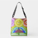 Lila, rote und gelbe Sonnenblumen mit fließenden grünen Blätter vor einem Regenbogen bilden diesen sehr hübschen und farbenfrohen Totenbeutel.