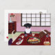 Happy Sushi Party Labradors Postcard für Labrador Fans! Schwarzes Labrador, Gelbes Labrador, Schokoladenlabrador sind alle im Bild gemalt. Drei Labrador-Kinder haben gerne ein Sushi-Party! Yummy Sushi ist auf dem Tisch im japanischen Zimmer. :) Whimsy und lustige Labrador Retriever Gemälde von Naomi Ochiai aus Japan.