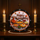 Diese fröhliche Rundgrafik ist eine festliche Hommage an den Erntedank. Ein Cartoon-Truthahn im Hut eines Koch neben einem Fest von Kuchen, Cranberries und Gemüse. Der Text "Happy Thanksgiving" wird hervorgehoben vorgestellt und ist somit ein perfektes Design für die Begrüßungskarten, Dekorationen oder eine Dinner-Einladung.