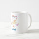 Eine personalisierte Kaffee-Tasse mit einem Kinderthema. . Ein glücklicher Einhorn fröllt unter einem bunten Regenbogen mit flauschigen Wolken. Blume, Schmetterlinge, Herz und Erdbeeren verleihen dem Design eine charmante Touch.