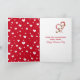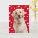 Golden retriever dog with red lipstick kisses on a red background with a white heart design.