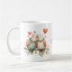 Whimsical love birds decorate this coffee mug. There are two images, one is flipped. Between them is text "Happy Valentine's Day" which can be changed. AI assisted graphic purchased with commercial use. Artwork: RedHeronLighthouse
