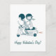 Happy Valentine's Day Lovely Postcard mit einem originellen zeichn eines Liebe Couple auf Vespa, er ist der Fahrer und sie sitzt hinter ihm und hält ihn um seine Taille. Statt Benzin aus dem Motorrad, gibt es wenig rote Liebe Herzen, die gleiche Farbe wie die Wangen der beiden Fahrer. Unten sehen Sie ein individualisierbares Sprichwort: "Happy Valentine's day!"