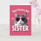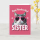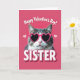 This greeting card shows a gray-and-white tabby cat facing forward against a rich fuchsia pink background. The cat wears oversized hot-pink heart-shaped sunglasses that cover its eyes, giving it a funny, confident look 🥰. Small pale-pink hearts float near both sides of the cat’s head, adding a gentle love theme without distracting from the face. Across the top, the text “Happy Valentine’s Day!” appears in curved white cursive lettering with a soft pink shadow. At the bottom, “SISTER” is written in large white all-caps letters with the same pink shadow, making it clear who the card is for. Details like the cat’s pink nose and bright white whiskers stand out against the smooth pink setting. It feels meaningful because it mixes affection with a little humor, like saying “I love you” in a way that can also make her smile ❤️.
