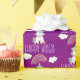 Gemustertes Verpackungspapier mit einer niedlichen Abbildung eines weißen Einhorns, das auf seinem Rumpf sitzt und lächelt und glücklich aussieht. Lächelnde Wolken und ein Regenbogenkopf. Im Text steht: Happy Vibes. Adorable Aufhellung Bild. Mit einem rosa lila Aquarellhintergrund.