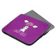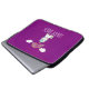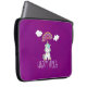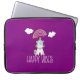 Ein Laptop-Ärmel mit einer niedlichen Illustration eines weißen Einhorns sitzend auf seinem Rumpf lächelnd und sieht glücklich aus. Lächelnde Wolken und ein Regenbogenkopf. Im Text steht: Happy Vibes. Adorable Aufhellung Bild. Mit einem rosa lila Aquarellhintergrund.