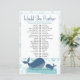 Happy Wal Baby Dusche Spielblatt für die Würden Sie eher erraten Spielaktivität. Das Design besteht aus einem Mama- und Babywal, der im Meer schwimmt und mit einem Rahmen aus Meeresblasen versehen ist. Es ist in skurriler Typografie mit bearbeitbaren Spielanleitungen und einer Farbpalette in den Tönen Blau, Wasser und Ozean grün. Wenn Sie passende Produkte wünschen, durchsuchen Sie bitte meine Happy Whale Kollektion oder schreiben Sie mir, um die Vorlagen hinzuzufügen, die Sie benötigen.