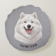 Dieses runde Kissen zeichnet sich durch ein KI-Bild eines glücklich weißen, samoischen Hundes auf grauem Hintergrund aus. Personalisieren Sie es mit dem Namen oder Foto Ihres Haustieres.