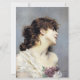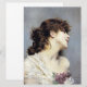 Dieses Design zeigt ein Gemälde des italienischen Künstlers Giovanni Boldini (1842-1931), der den größten Teil seiner künstlerischen Karriere in Paris, Frankreich, lebte und arbeitete. Es zeigt eine schöne Frau, die ein weißes Kleid trägt, das diaphanisch, durchsichtig und halbtransparent ist. Sie hat braune Haare mit natürlichen Vorgängen. Ihre Haut ist cremig und klar. Sie lächelt und fröhlich, während sie nach rechts schaut. Sie ist eindeutig voll von einer wunderbar unschuldigen Art von Glück. Die Frau hat auch einige violette Blume an ihrem Kleid befestigt.