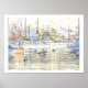 Schöne digitale Kunst aus einem Foto, gemacht in sehr hellen Farben und Linien, eines Hafens im Morgengrauen mit einem braunen Pelikan in der Mitte auf einer Bouy. Sehen Sie als großes Poster oder Druck oder kleiner.