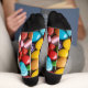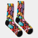 These crew socks are as sweet as candy that's right there is all kinds of hard candy on the socks and the candy is colorful.