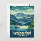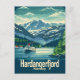 Eine atemberaubende und nostalgische Darstellung des Hardangerfjords, Norwegens zweitlängsten Fjord, feierte für seine dramatischen Landschaften und seine natürliche Schönheit. Das Design vereint die majestätischen Felsen des Fjords, die über tiefblaues Wasser stürzen, mit Wasserfällen und üppigen grünen Obstplantagen während der Frühjahrsblüte. Das Vintage Kunstwerk erinnert an die ruhige Atmosphäre und die beeindruckenden Ausblicke auf den Hardangerfjord, die den Betrachter einladen, seine unberührte Wildnis und seinen landschaftlichen Charme zu entdecken.